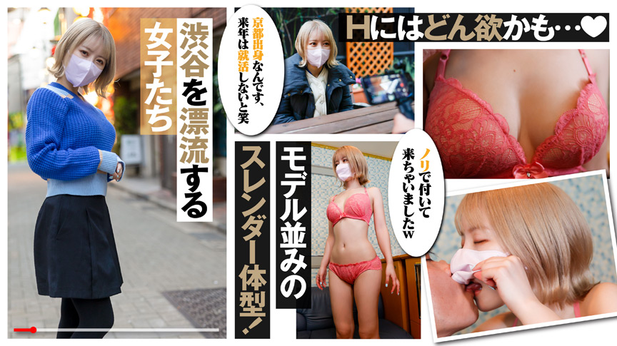 【渋谷の街頭でのインタビュー】今回、足を止めてくれたのはインテリア系の学校に通う女子学生23才ここみちゃん。スレンダー白い肌に金髪でめちゃくちゃ可愛い。どうしてついてきてくれたんですか?「ノリ(笑)」今って彼氏とかいらっしゃるんですか?「半年いないです」半年、彼氏がいないという事は半年間なにもしてないんですか?「学校終わりとかに渋谷が多いかな…アプリとかで知り合った人と…」アプリとかで知り合った人としました?「しました…(笑)」SEXに対しては?「どん欲だと思う。相性が良ければ何回もしたい方です」片手で抱えられそうな小柄で可愛らしい体系のここみちゃんのリアルセックスに期待が膨らみつつホテルへ移動。ちょっと緊張、恥ずかしい…と男優さんに会うなり乙女な一面。ベロチューしたり優しくボディタッチしていくと「うふ…」と笑いつつ可愛い声で反応…トロンとした目ジュンとパンツがすでに濡れて湿ってる…体の反応が素直な子です。【一緒にお風呂へ】超美肌に綺麗なピンク色の可愛い乳首…股間に目をやると剛毛そのギャップがエロっ!シャワー浴びる前のちんこをおねだりすると、パクっと小さいお口で咥えて、ゆっくりじっくり口に含んでフェラしてくれます「あーやばい出ちゃうからやめましょう」お口パンパンにしてフェラしてる可愛い顔見てたらイキそうになっちゃいます。お風呂でエチエチした後にベッドへ。両手にすっぽり収まる、小さくて華奢な身体は抱き心地最高。抱きしめながらベロチュー・耳舐め・乳首指で刺激。あれ?鳥肌立ってる?「すっごい敏感なの…」と可愛い。膝立ちになって、ちんこを差し出すと小さいお口パンパンに咥えフェラ。ベロをローリングさせ亀頭べろべろ責めてきたり。咥え込んでバキュームフェラ、のど元に根元まで咥え込む…やっばい!たまらん。挿れちゃっていい?生でいい?「え?大丈夫なの」そのまま「え?」中に出さないから。正常位で生挿入。「おっきぃ」とここみが苦し気にあえぐ。ゴムと生どっちがイイ?と聞くと「えー…生」と答えるHな子です。生マンコ最高、キツキツですが容赦なく激ピストン。ここみがのけぞる、枕をつかみ苦悶の表情でハァハァ息を荒くし果てる。バックから挿入、突き出した小さくて形のイイお尻…狭!メリメリ挿ってく。ここみ「うーあーーん」と唸る。ここみの細い片腕を掴み激ピストン…上半身ベッドに崩れ落ちるそのままチンコを子宮にグイグイ押し付ける「うーんイイ…うーんイクイクイク」。激しくボッキしている仰向けに寝そべると、発情したここみが馬乗り騎乗位。ここみのちっちゃいまんこに少しずつ挿入。M字になりスパイダー騎乗位喘ぎながらパンパン腰を打ち付ける。ここみを上に乗せたまま、下から激しく突きあげる。ベロチューしながら正常位で深挿れ鬼ピストン。ここみ苦し気に「うんうん」と喘ぎまくる。最後一緒にイク?…と聞くと、ここみ「え?えっ?」といいながらも喘ぎまくるので、ビュルビュルっ中に放出しチンコ抜くと、ここみは溢れてきた精子を指ですくって驚いた顔で「え?」っとつぶやく。ホテルからでてくるここみ。いかかでしたか?「え?…すっごい激しくてびっくりうふふ(笑)」満たされました?「はい、満たされました。またやってみたい(笑)」と、満足げに街へと去っていくここみ。渋谷という場所に目的あるやなしや漂うように歩いている「今」という時代を生きている若い彼女たちは何を好み、何を恐れ、何を糧に生きているのか。顔を半端に隠すという条件でマスクを着けたままAVに出演する事を前提にありのままの自分をカメラの前で語って、セックスというむき出しの自分をカメラの前で見せてもらいます。渋谷を今を生きる女のリアルセックスをお楽しみください!!