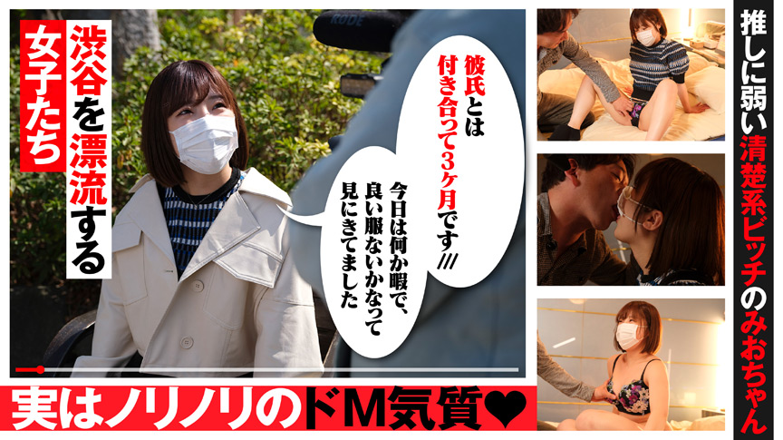 【渋谷の街で街頭インタビュー】今回、足をとめてくれたのはアパレル勤務の23才みおちゃん。今日は何しに渋谷へ?「今日は時間あったんで何かいい服ないかなぁって思って渋谷に着ました。新宿にはない服があったりするので」どうしてついてきてくれたんですか?「興味です」AVは観ますか?「見ます。結構バラバラなんですけど、イチャイチャ系とか風俗ものとか見ます」彼氏はいますか?「います。まだ3か月くらいです!ラブラブな時期です!」彼氏にバレなければ大丈夫というみおちゃん。バレませんように…(笑)体験人数は?「20人くらいです」23才で20人は多いですね。マッチングアプリに一時期ハマっていたこともあるというみおちゃん。飲みに行ってそのままホテルに流れてしまうことも多々。そりゃ経験人数増えちゃいますね(笑)初体験は意外にもちょっと遅めの18才。理想的なSEXは、ずっと可愛がられてる感じのイチャイチャ系がお好み。まだ、中イキをしたことがないというみおちゃんは、少し早漏の彼氏に不満があるそうです(笑)彼氏と終わったあとに1人でしちゃったり、ウーマナイザーも自分で買って使っちゃったとか。今日は、その不満を解消してもらいましょう!!【ホテルへ】脱ぎづらそうなワンピースですね。と言われながらおっぱいを触られ、「そこ…」と、乳首にひっとしたのかHな表情になるみおちゃん。ワンピースを脱がせてパンツ越しにアソコ触ると、ココ?「すぐ当てられちゃう(笑)」と照れ笑い。乳首もアソコも両方弱いみたいです。乳首の周りを、じっくりゆっくり責めるられながらじらされるのを喜ぶみおちゃん。マン毛をもてあそばれ、尻を揉まれ、アナルを優しく触られる。舐められるのも吸われるのも好きと男優にアピール。「こっちも舐めて」とクンニをおねだり。濡れ濡れでぴちゃぴちゃと音をたてるマンコ。乳首にもクリにもローター当てられると、周りがてかてかに濡れて光る。指を入れながらローター当て続ける。「あっあん気持ちい…ああ…」喘ぎだすみおちゃん。激しく手マンされ、ぐちゃぐちゃ音を立てるマンコ。「めっちゃ気持ちいい」身体が火照ったのか汗ばんでくるみおちゃん。ギンギンにたってる男優のチンコを咥え、口いっぱいに咥えてストロークさせる。「上手ですか?私?」と恥ずかしそうに聞く。ひたすらしつこくストロークする。いつも彼氏にやってるようにやってみて。「こんな感じ…」みおちゃんのテクに男優おもわず発射。少し休憩したあとはクンニで責められる。「きもちいぃぃ…」指入れされながらぺろぺろペロペロ。「あーんきもちい…」挿入を焦らされるみおちゃん。「いれたい」とおねだりする。「すごい…彼氏1回イったら無理だから…」正常位でゆっくり挿入すると「かたい…あ…きもちいい…あっつその辺で止めて」男優深入れせずに優しくピストン。「この向き一番好き」ゆれるおっぱい苦し気にあえぐみおちゃん。男優の手をぎゅっと握る。だんだん早くなるピストンと共に喘ぎ声が激しくなるみおちゃん。「うーーんきもちい!!」「すごいめっちゃ動いてくれる!!」その後も立ちバック、開脚、騎乗位と様々な角度から突かれメス声が止まらない。「めっちゃちんちんきもちいい!!!!」最後は、正常位でクリを触られながらのピストンをまたしたい!と男優におねだり。いよいよフィニッシュ。ちんこを抜くとみおちゃんの割れ目を伝う精液をぬぐってもてあそぶ。「めっちゃ出てるうふふ…めっちゃ出されちゃった…どうしよ…まぁいっかめっちゃ気持ち良かった、ありがとうございました」【ホテルの外へ】今日はどうでしたか?初めての中イキは出来ましたか?「めっちゃ楽しかった、彼氏だと満足できない分すごい満足できました。ナカイキはまだできなかったんだけど…でもなんだろうもう少しで(中で)イケそうってところまでイケた」みおちゃん。彼氏には絶対にバレないでくださいね!!(笑)