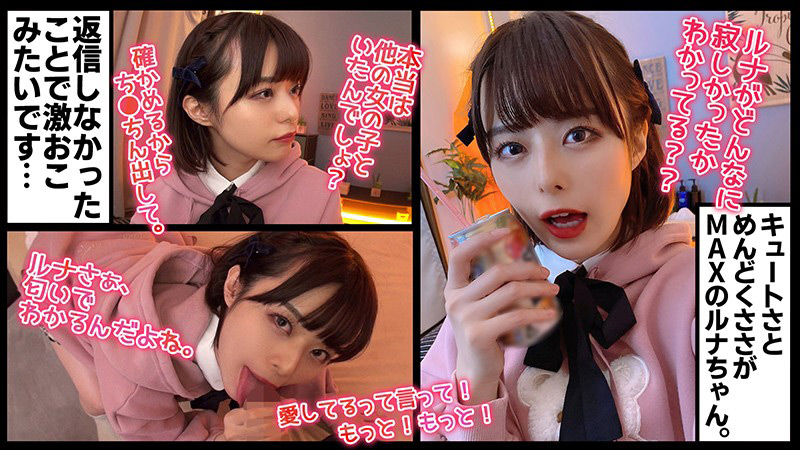 今回の地雷系女子はショートカットが超キュートなのにめんどくささMAXなルナちゃん。可愛いくて男に不自由しなさそうなのに自己肯定感が低く依存体質。「ルナだけのおち○ち○?ルナ専用?」と言いながらシコシコするもんだから、勃起不可避…「勃起してるんだが…どうしてほしい?ペロペロしてほしい?」といいながら「好き?愛してるって言って!!」と言いながらもいやらしいフェラで気持ちくなってきました…「いっぱい気持ちいいことして!!」とM字でパンツからちょっとま○こがはみだしながら「いっぱい見ていいよ」とエロすぎでしょ…愛されたいが故に言うことは比較的に聞いてくれるし、何でもやってくれるからヤメられない!おっぱいもま○こも超絶敏感、大好きなおもちゃを使うとすぐに『あぁ~だめだめイクイク』というから焦らすと「らぁめぇぇ~もっと気持ち良くしてぇぇぇ!」とおねだり顔が最高!我慢できずパイパンびちょびちょま○こに挿入開始!ちょっと動いただけなのに「あぁぁぁ~だめだめいっちゃう、いっちゃう、もっともっとぉぉ」と喘ぎまくり!最後は可愛い顔にかけて最高なセックスを楽しみました。