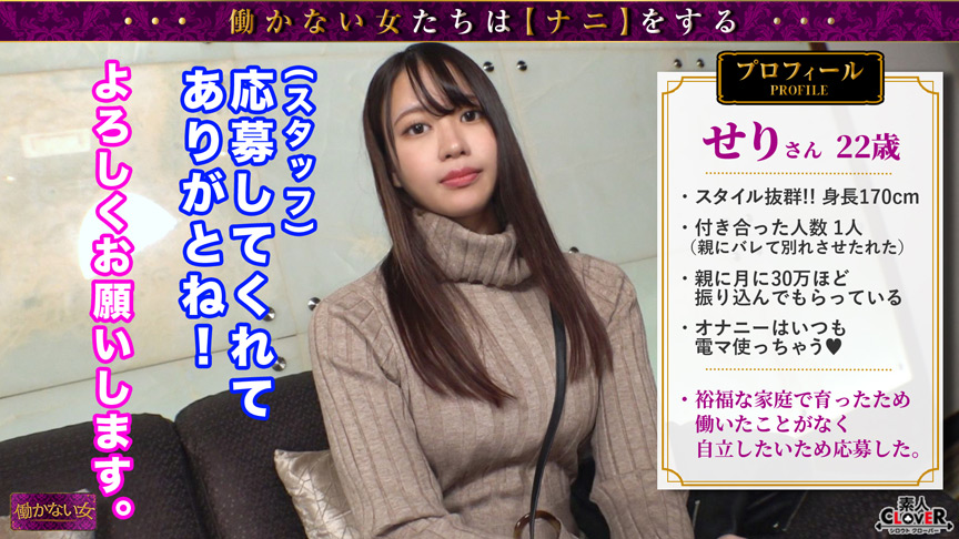 定職に就かずに生きる女性達のリアルを調査!私生活からエッチな事まで徹底深掘りするドキュメンタリー企画!今回の応募者は【親ガチャ一発大当たり!?超お金持ちの家系に生まれた世間知らずのお嬢様『せり』さん】親の監視が厳しく自由がない生活…(※月30万のお小遣い有)そんな彼女に我々スタッフが自立支援のご協力(?)経験人数一人のほぼ新品BODY…!!汚れ無いお嬢様のアナルはまさに気品漂っておりました…。極太バイブ挿入に目覚めるM心!?人生で2本目のおチンポを前にぎこちないフェラがまたそそる…。元カレとはいつもナマだったけど押し切られ予想外の生挿入!処女に等しいマンコにピストンッピストンッ!徐々に大きくなる喘ぎ声…そして迎える絶頂!!初めての生ナカに恍惚の表情を浮かべ『稼ぐって大変ですね…。』と一言。お嬢様、ご協力ありがとうございました。